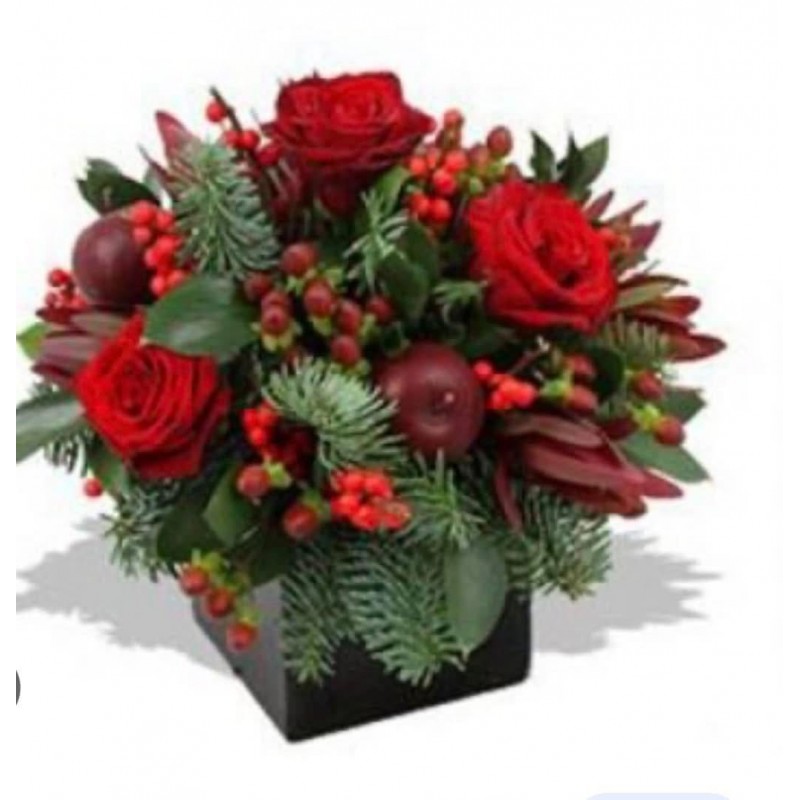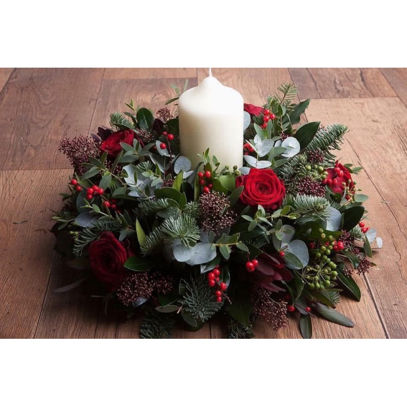 Beautiful Christmas Table Arrangements with a candle , available in all whites and silver, red traditional or mixed traditional
